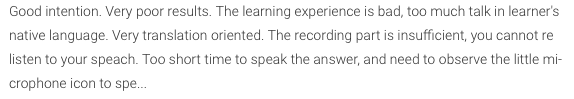 Un contenu riche en nombre, certes, mais l’est-il en qualitĂ©âŻ? Est-il en adĂ©quation avec votre objectifâŻ? Beaucoup de questions se posent… PassĂ© l’effet d’annonce le contenu se rĂ©sume surtout Ă un gros dictionnaire ce qui peut intĂ©resser certains apprenants.