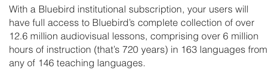 Nous avons Ă©tĂ© impressionnĂ©s dĂšs le dĂ©part par l’argumentaire choc « learn XXX languages » avec le « meilleur apprentissage du monde » et l’apparente masse de donnĂ©es (8 M lessons) en mode big data… Ajoutons la trouvaille de l’oiseau bleu comme logo, un symbole rĂ©seau dĂ©jĂ observĂ© dans la nature. Par dĂ©cence, nous n’ajouterons pas « n’importe quoi » au slogan ci-dessous.
