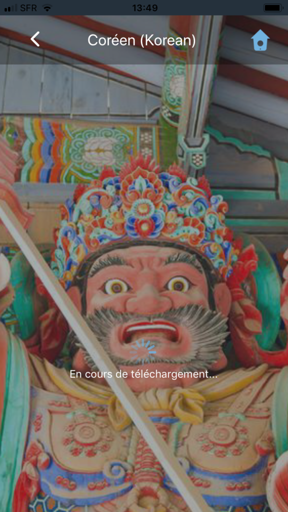 Une carte « mot » ici Ă©crit en « hangeul », l’icĂŽne en haut avec le A permet la lecture en caractĂšre latin. Pratique. Touche avance et touche retour (la plus intĂ©ressante). Le temps restant Ă Ă©tudier est indiquĂ© pour connaĂźtre Ă tout moment l’approche de la rĂ©crĂ©…