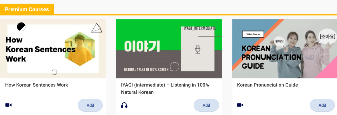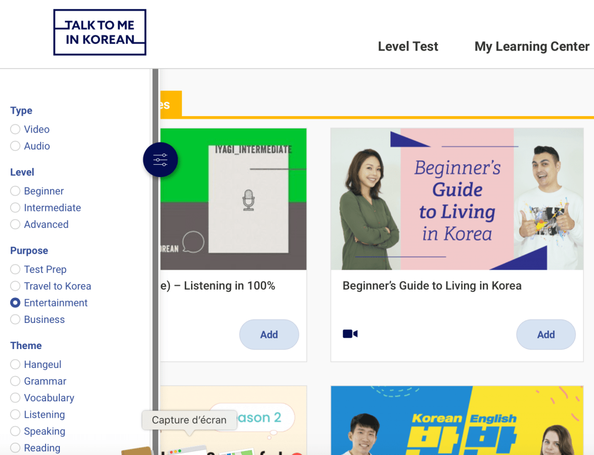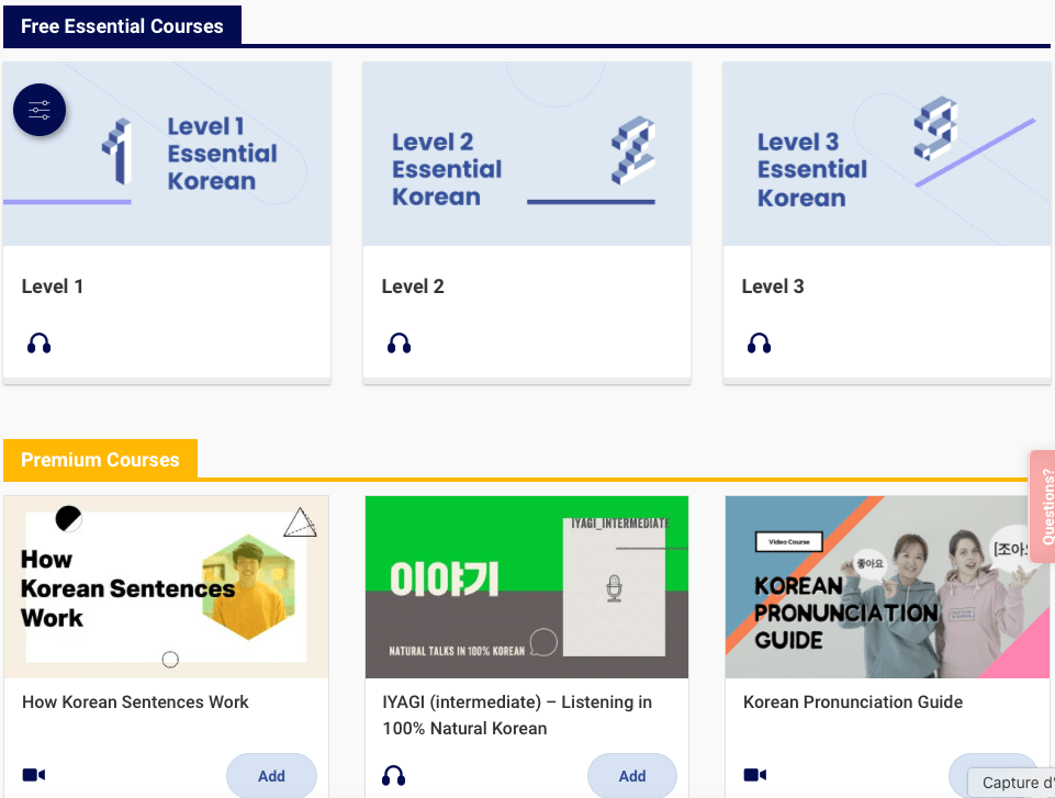 TalktomeinKorean s’adresse surtout Ă des apprenants autonomes qui crĂ©eront ici un parcours composĂ© de modules sĂ©lectionnĂ©s Ă l’aide de la page « cours ». Les produits sont multiples et judicieux, de tout niveau, gratuits ou payants avec de multiples supports possibles (numĂ©rique, vidĂ©os, papier…). Une organisation et vision hors du commun.