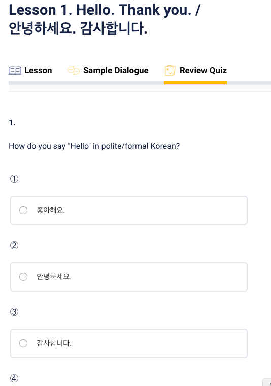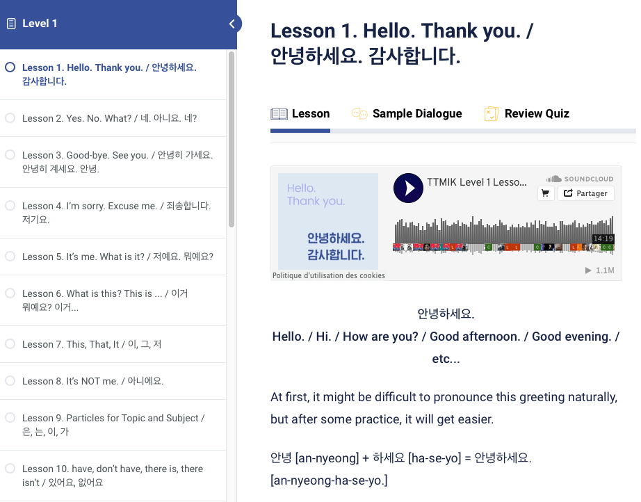 Talktomeinkorean n’est pas vraiment une application, mais plus une banque de ressources sĂ©rieuses et pointues. Le site est en fait surtout une boutique en ligne pour acheter des mĂ©thodes et supports bien conçus et structurĂ©s pour un vrai apprentissage du corĂ©en. La gratuitĂ© de nombreux modules en fait toutefois un site exploitable par tous.