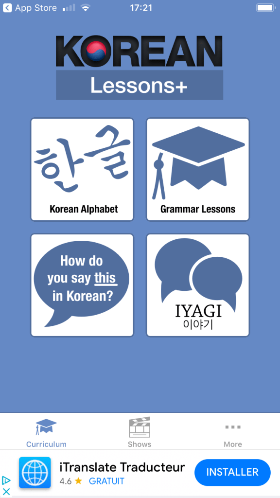 Il ne s’agit pas tout Ă fait d’une application indĂ©pendante malgrĂ© l’apparence sur les sites de tĂ©lĂ©chargement, mais d’une adaptation et porte d’entrĂ©e promotionnelle du site Talktomeinkorean (de qualitĂ©). Il propose des Ă©lĂ©ments gratuits du site comme les leçons, mais aussi une panoplie d’outils pour dĂ©couvrir ou travailler le corĂ©en. Un assortiment un peu Ă©trange entre contenus grands dĂ©butants et le reste plutĂŽt avancĂ©s.