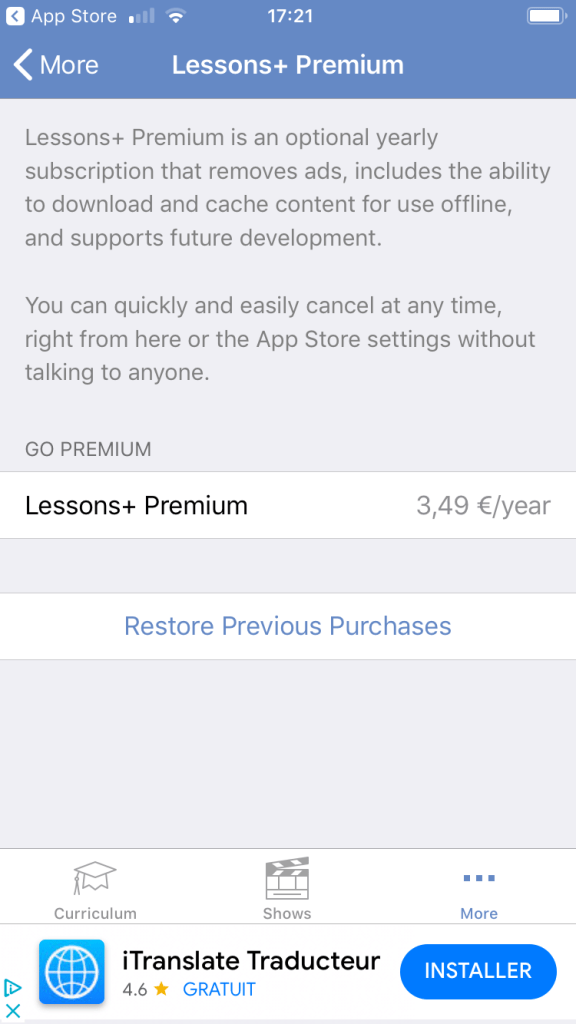 Curriculum (les cours) – Shows (banque de vidĂ©os) – « more » (quelques rĂ©glages dans « more », repaire de pub pour des cours)