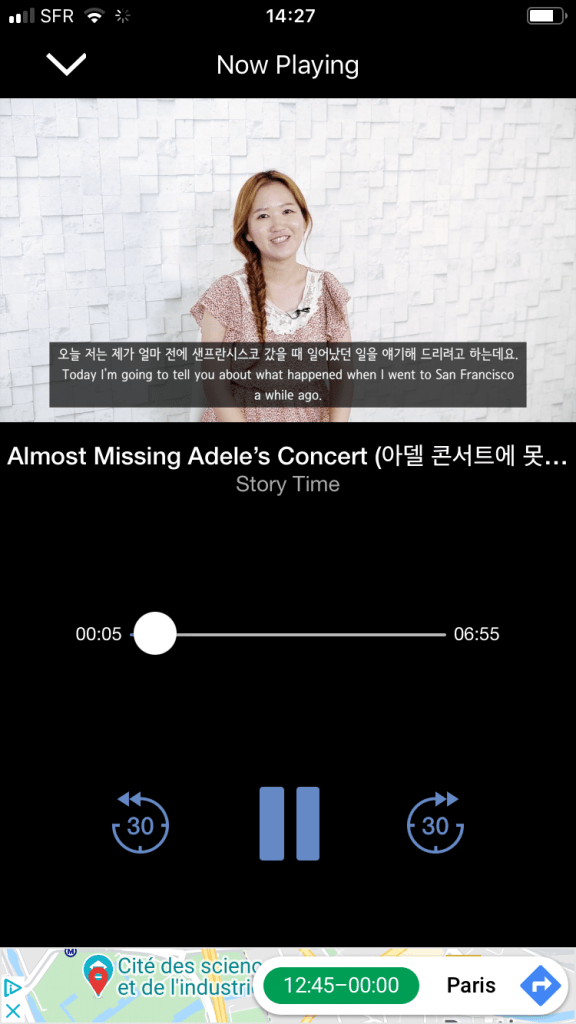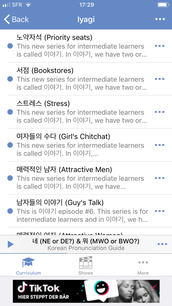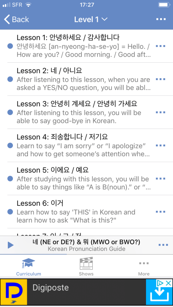 Un gĂ©nĂ©reux choix pour dĂ©couvrir le corĂ©en dans son contexte. Alertes et vivantes, elles s’adressent Ă des locuteurs plutĂŽt avancĂ©s en raison de la vitesseâŻ! Noter, au-dessus de la pub du bas, une flĂšche et ligne utile pour la navigation et arrĂȘter les conversations en cours… AccĂšs aux fonctions arrĂȘt, retour et avance.