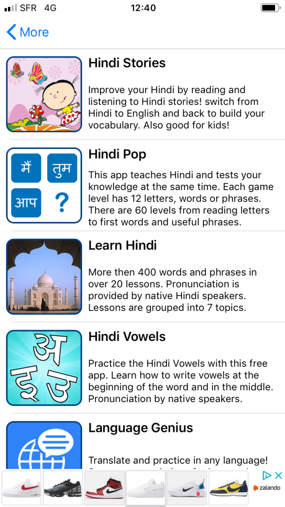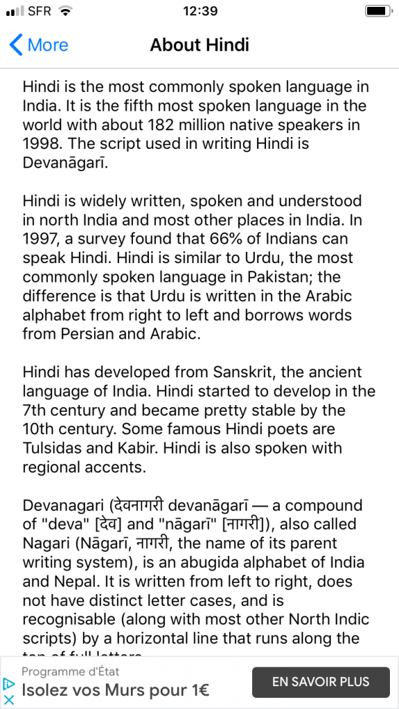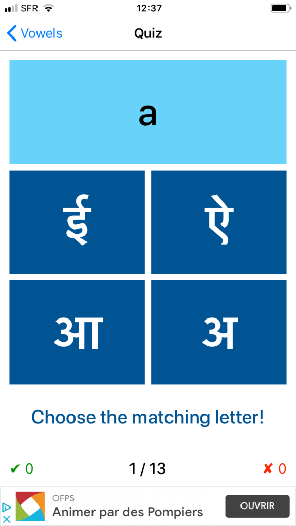Une petite famille d’applis pour apprendre l’alphabet de l’hindi (Ă©criture devanagari). Celle prĂ©sentĂ©e comprend les principales lettres qui s’affichent dĂšs la premiĂšre page. Pas d’introduction, de discours ou d’argumentaires inutiles, mais directement dans le vif du sujetâŻ!
