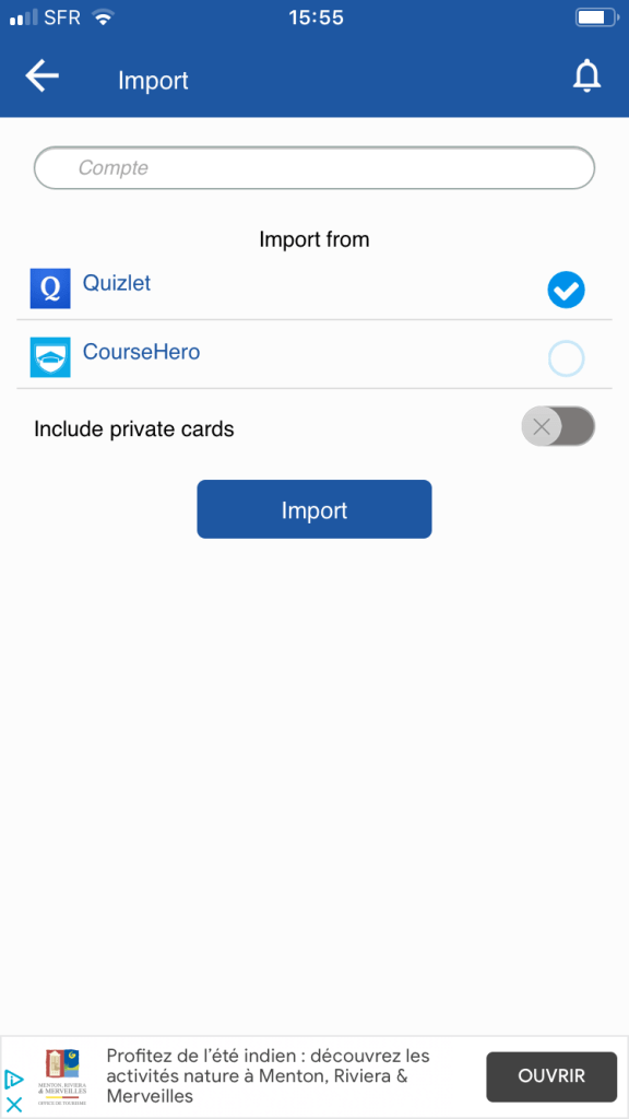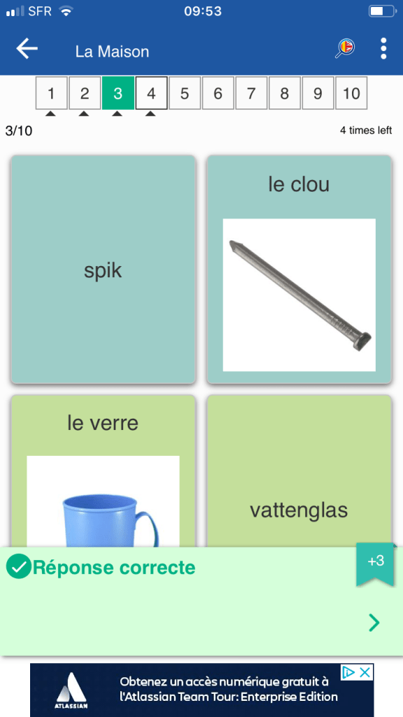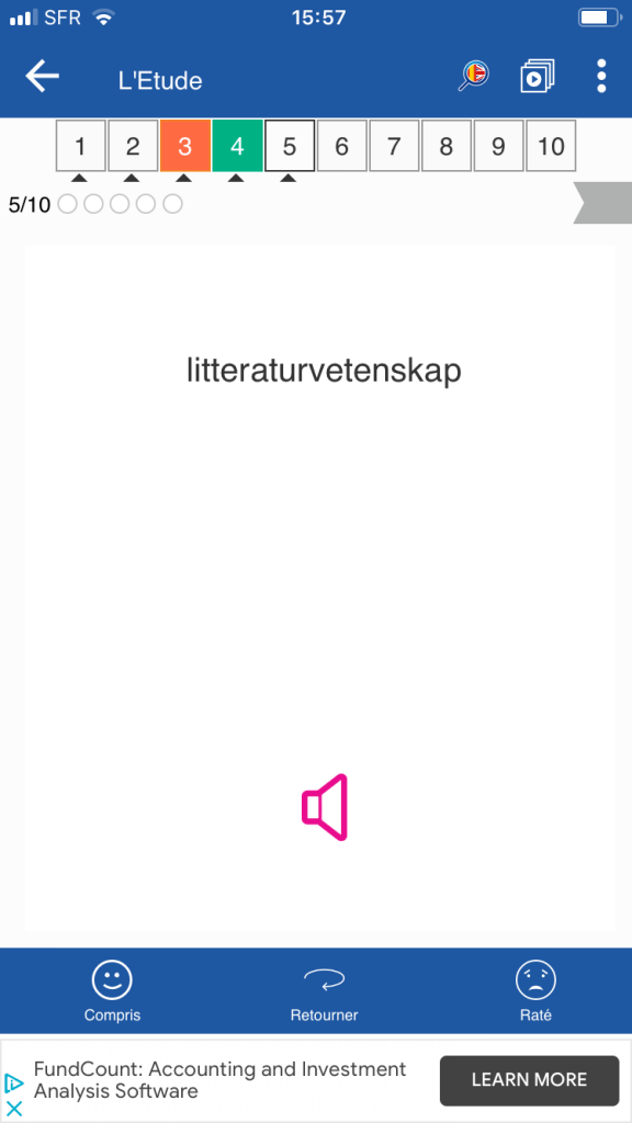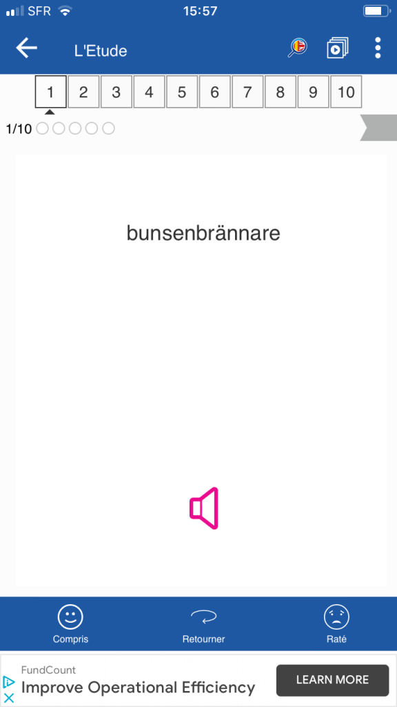 Pour chaque carte, on peut indiquer « compris » ou « raté » pour gérer sa liste (la couleur verte ou orange s’affiche alors et permet de visualiser vos progrès dans la série chiffrée du haut). Le fanion en haut à droite permet d’ajouter la carte à ses « favoris ». On peut, en cliquant sur une case (une série de 10 mots), étudier dans le désordre ou privilégier avec un réglage le type de mots (connus ou pas connus).