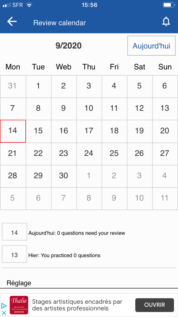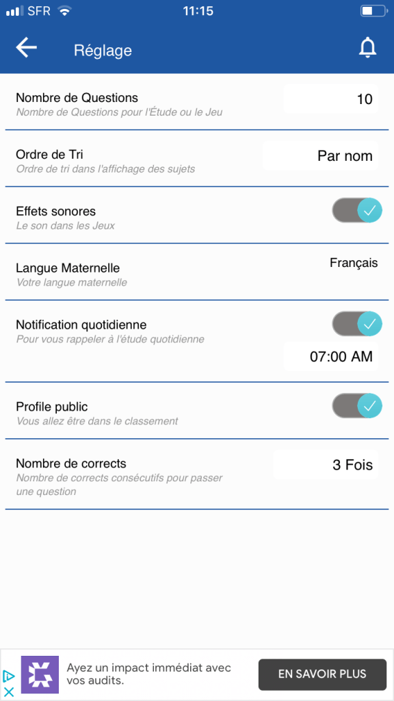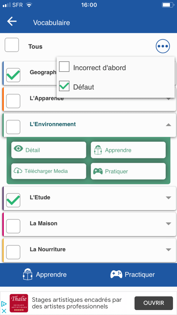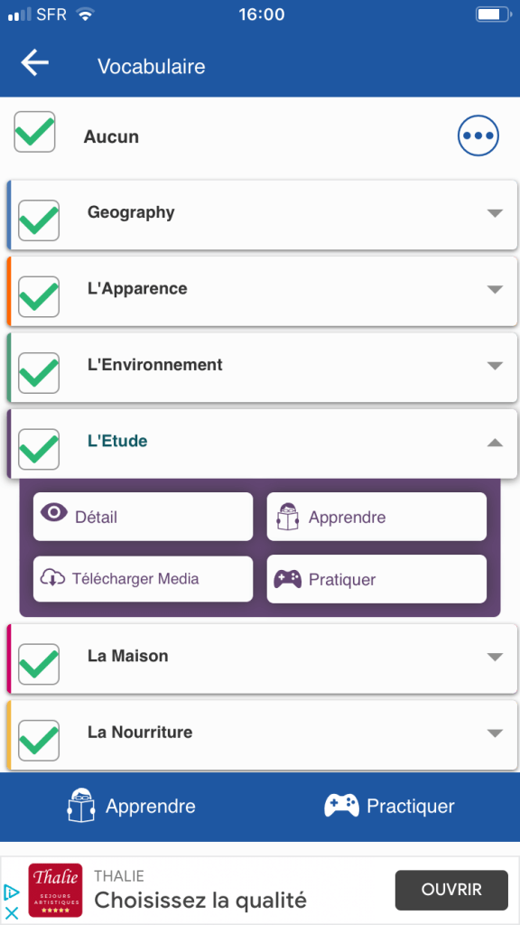 L’application dispose d’un menu principal (image ci-dessus) et annexe (apprendre et pratiquer) en bas d’écran, mais aussi d’un sous-menu (en couleur) qui accompagne les thèmes de mots à apprendre. D’autres menus sous forme d’icônes sont présents comme pour le dictionnaire (la loupe en haut) ou des réglages divers. On peut s’y perdre un peu, mais c’est le reflet de la richesse des fonctions… L’usage de couleurs permet de donner un brin de fantaisie au programme.