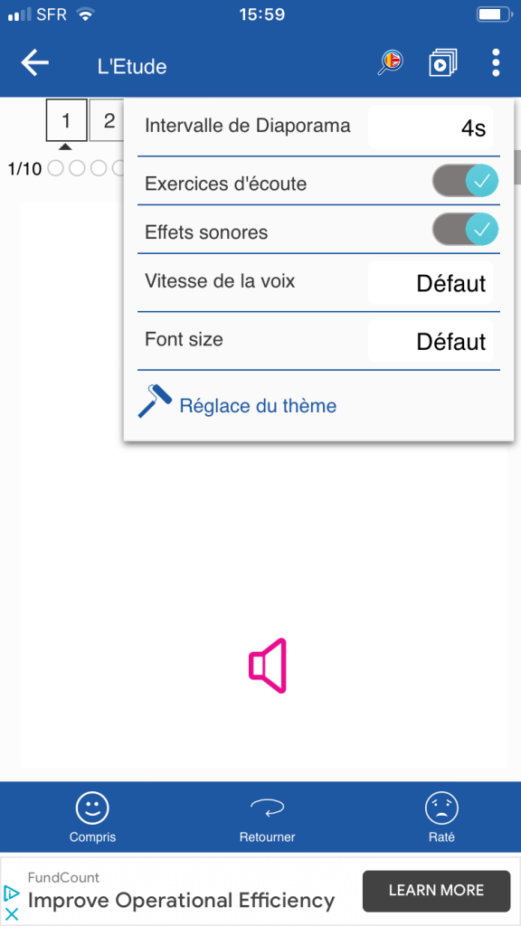 L’application se concentre sur l’acquisition de vocabulaire (environ 6000), un bon chiffre… La première étape est le choix du thème du vocabulaire à étudier. Cocher la ou les cases. « Aucun » vous affichera tous les thèmes. On aperçoit ici le sous-menu dédié en violet. Le thème choisi fait apparaître alors une série de cartes (avec l’audio) avec une face image et l’autre texte. Le bouton « retourner » permet de passer de l’un à l’autre.