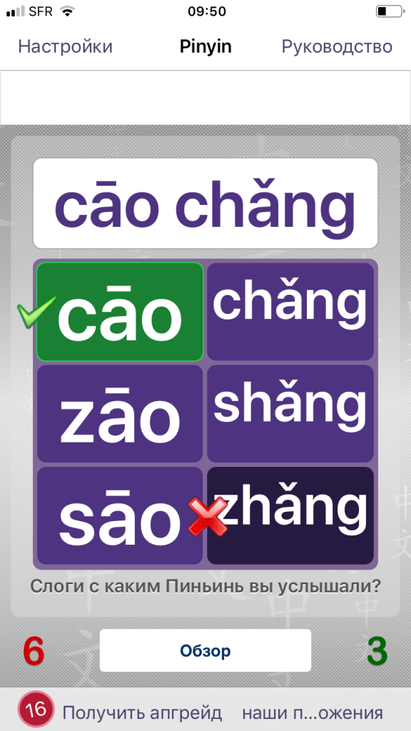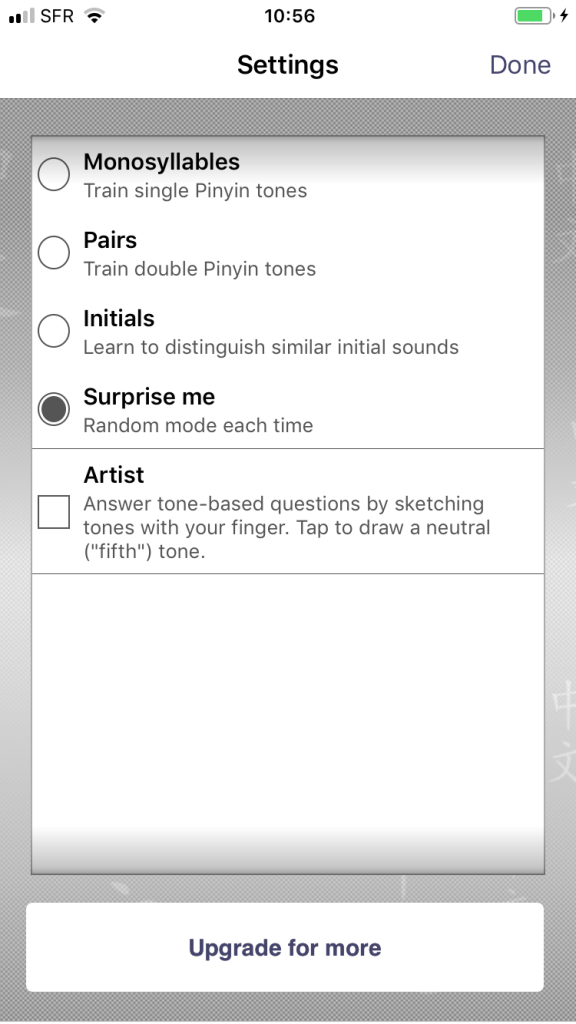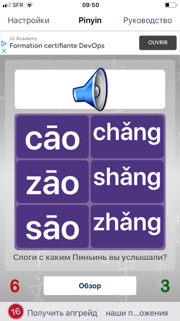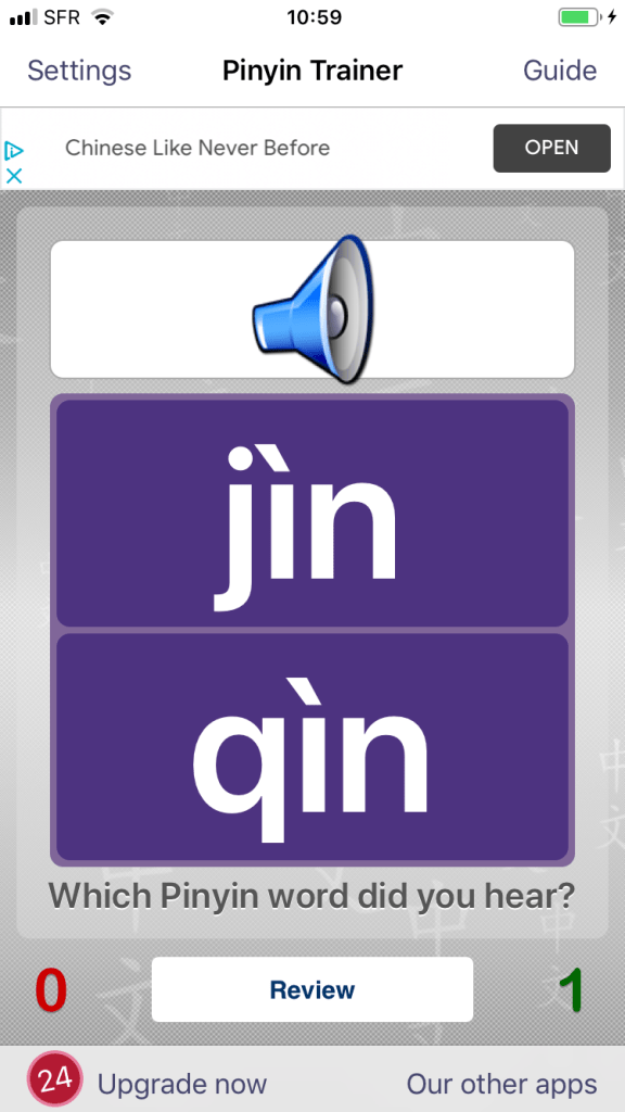 Une application toute simple, mais ultra performante dans la diffĂ©renciation des tons chinoisâŻ! Attention, le nom peut varier selon la langue. Veillez aussi Ă vĂ©rifier vos prĂ©fĂ©rences de langue du mobile, car elle est choisie selon l’ordre dĂ©fini dans vos rĂ©glages (Ă nos premiers essais entiĂšrement en russe avant de comprendre et sans possibilitĂ© de changement dans l’application).