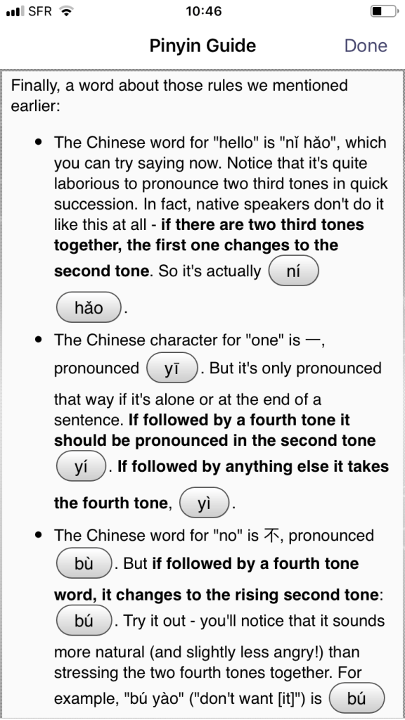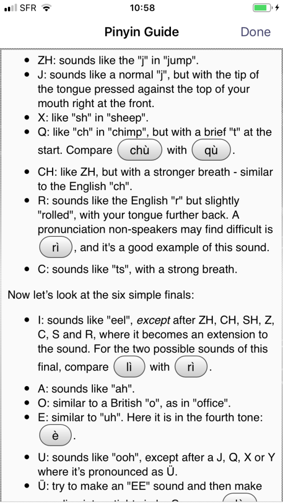 Notons que l’application est particuliĂšrement utile au dĂ©but de son apprentissage pour acquĂ©rir la prononciation avant la lecture, le pinyin devant rester une bĂ©quille quand on ne connait pas la prononciation (utiliser aussi les dictionnaires phonĂ©tiques). On dĂ©couvre aussi avec « hao » toute la mĂ©diocritĂ© de cette transcription pinyin pour un apprenant non natif. Ayant pratiquĂ© le BOPOMOFO avec un professeur taĂŻwanais (en usage lĂ -bas) avec la mĂȘme liste de phonĂšmes (mais par le biais d’une liste rĂ©duite de caractĂšres simples), j’en perçois grandement la meilleure qualitĂ© pĂ©dagogique de ce dernier, car on apprend sans aucuns caractĂšres latins! HĂ©las…