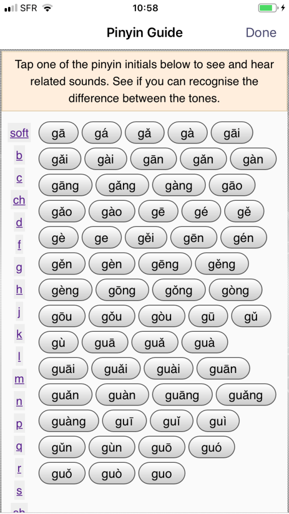 Le guide du menu n’est pas le mode d’emploi, mais une leçon de pinyin avec un tableau interactif des diffĂ©rents sons possibles. Ă relire avant de commencerâŻ!