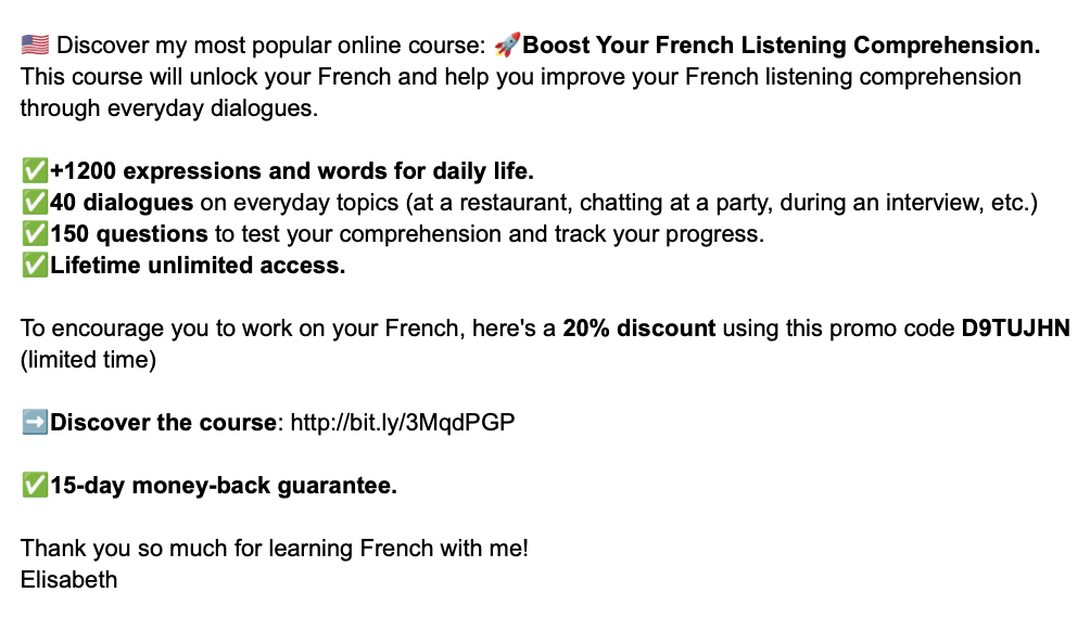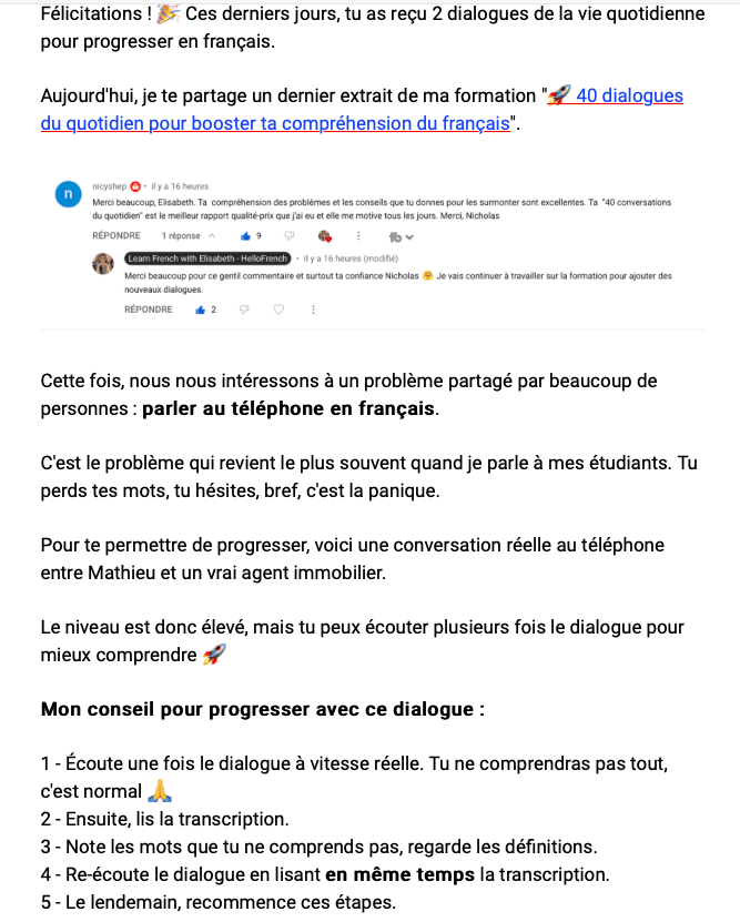 L’ambition, atteinte, est de faire dĂ©couvrir un français vivant et usitĂ©, pas celui des manuels. Un cĂŽtĂ© trĂšs vivant et rafraichissant dans sa prĂ©sentation qui motivera bien des apprenants. L’origine belge d’Elisabeth, qu’une oreille avertie dĂ©tectera non pas pour son accent, mais par l’absence d’une certaine touche d’arrogance française (surtout Ă Paris), est ici un grand plus par son approche « out of the box » des tics et travers de la langue. Rappelons que le français appartient aussi aux Belges francophones et n’est donc pas l’apanage d’un hexagone…