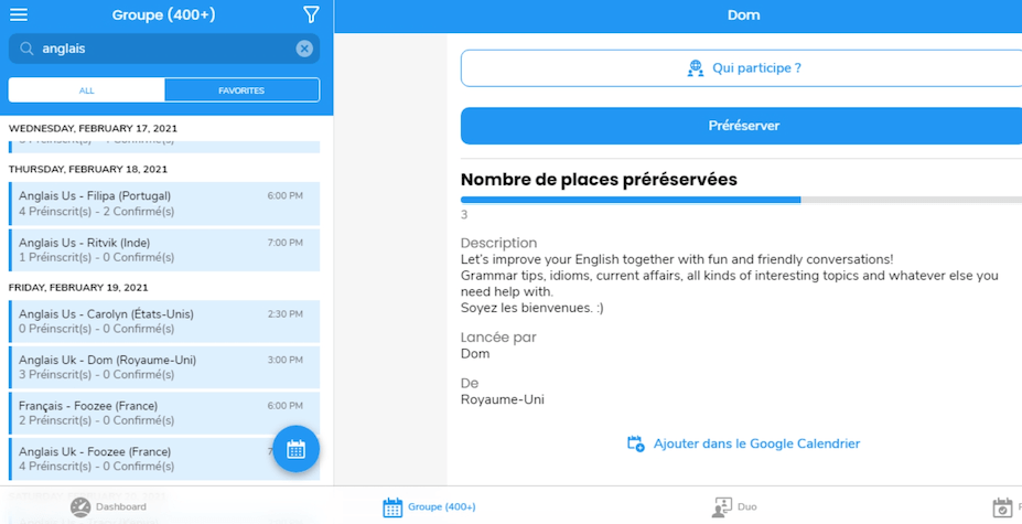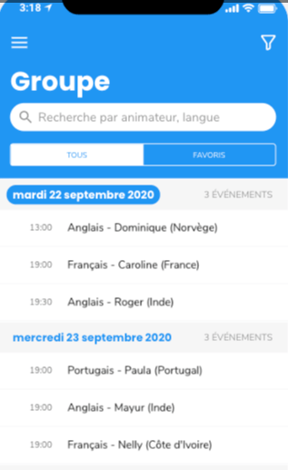 La fonction groupe dans le menu du bas vous permet d’aller trouver une rĂ©union organisĂ©e avec les dĂ©tails (animateur, sujet, horaire, participants inscrits…) pour faire le bon choix. Vous pouvez aussi enregistrer dans vos favoris vos prĂ©fĂ©rĂ©s pour les retrouver. Simple et bien vuâŻ! Cette fonction particuliĂšrement bien conçue est l’un des grands atouts de l’application, car il permet avec facilitĂ© de trouver une place et de se lancer dans l’aventure mĂȘme pour les plus hĂ©sitants.