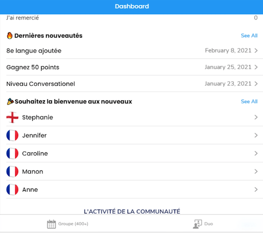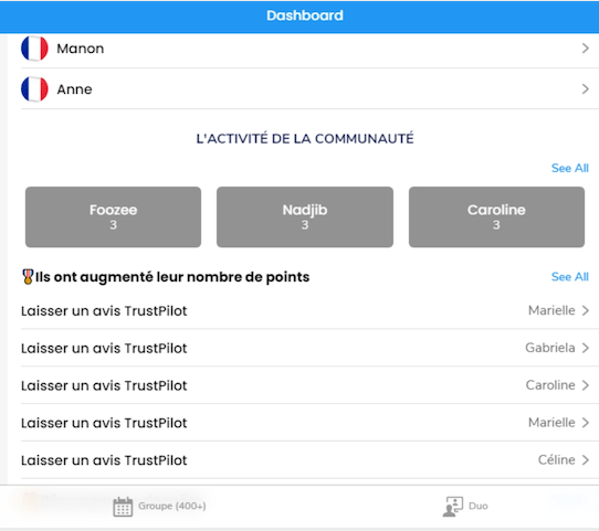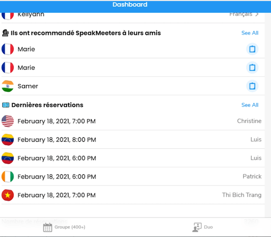 L’interface d’accueil, le Dashboard, vous permet d’accĂ©der Ă la recherche de groupes, celle du mode duo (en individuel) et aux rĂ©servations effectuĂ©es. Le menu est en bas. Quelques affichages d’infos Ă©galement pour vous mettre dans l’ambianceâŻ!