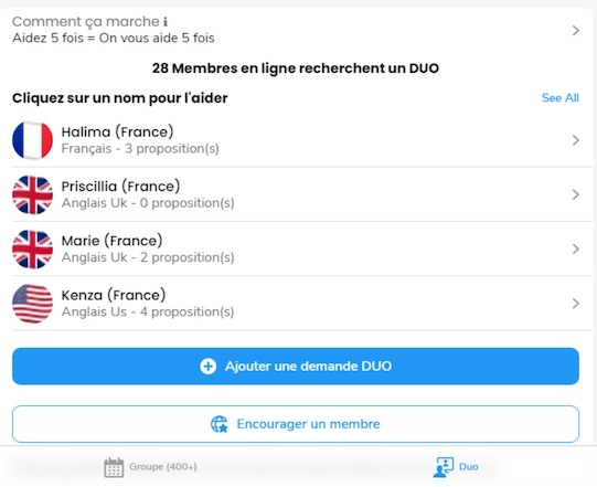 Le Duo bĂ©nĂ©vole permet d’accumuler des droits pour choisir de bĂ©nĂ©ficier Ă son tour d’une aide dans une autre langue. On peut choisir une autre personne ou groupe Ă©vitant ainsi l’Ă©change unique parfois difficile Ă trouver (cours de Bambara contre anglais). Reste que les tuteurs d’anglais rafleront la majoritĂ© des mises en raison de la demande…