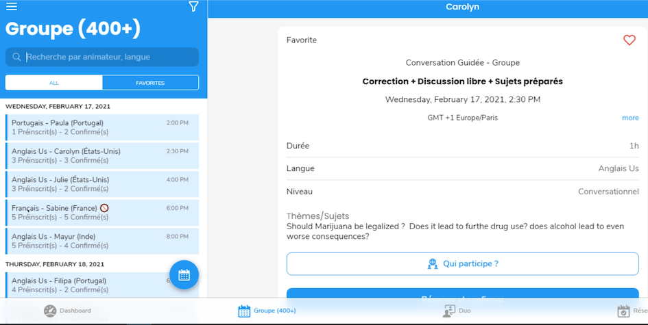La conversation est organisĂ©e, il ne s’agit pas d’un chat de potes en mode improvisation, mais d’une vĂ©ritable animation structurĂ©e. Ă partir du thĂšme prĂ©vu, On cherche en gĂ©nĂ©ral Ă faire parler Ă tour de rĂŽle chaque participant en les invitant Ă construire une phrase originale. Une correction « live », le plus souvent dans la langue cible pour une rĂ©elle immersion (selon les niveaux), est immĂ©diatement donnĂ©e. En Ă©coutant les autres et la correction, vous percevez aussi les erreurs d’un francophone. InstructifâŻ! Le groupe est limitĂ© Ă cinq participants + l’animateur pour une sĂ©ance efficace. Une moyenne de participations de 3 Ă 4 fois par semaine est constatĂ©e, ce qui accĂ©lĂ©rera votre accĂšs Ă la « fluency ».