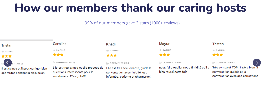 Soyons clair : il est bien prĂ©cisĂ© « caring hosts » pas « teacher »! MĂȘme s’ils sont qualifiĂ©s et certifiĂ©s, il ne s’agit pas de diplĂŽmes ou de certificats officiels (cela peut toutefois ĂȘtre le cas selon les profils). C’est simplement l’approbation de l’Ă©quipe du site. Attention Ă ne pas vous induire en erreur, vous ĂȘtes clients du service, mais pas celui de l’animateur…