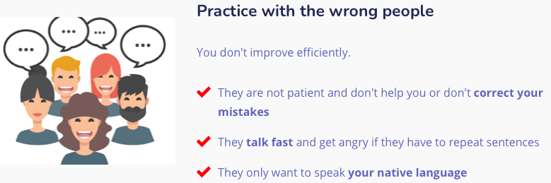 Speakmeeters, issu d’une longue expĂ©rience de rencontres linguistiques (Tripmeeters), dĂ©nonce avec vĂ©ritĂ© les dĂ©fauts des autres formules sur son site comme sur cette image :