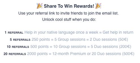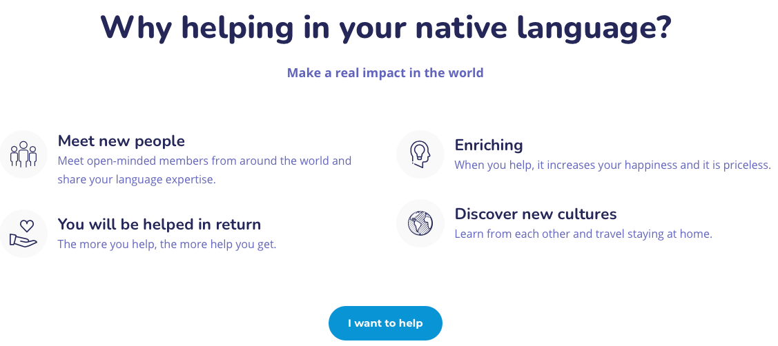 Le principal avantage de votre action de « caring host » est de pouvoir faire vous-mĂȘmes des sessions gratuites en rĂ©compense. Un bon truc, mais plutĂŽt pour polyglottes passionnĂ©s.