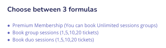 Une formule abonnement avec des avantages et des rĂ©ductions. Attention, le « unlimited » est limitĂ© aux sessions de groupe. Une formule Ă©conomique si vous ĂȘtes en phase intense d’expression orale. Sinon, plus souple, les packs de tickets avec une judicieuse rĂ©partition des packs en fonction des besoins. Inscription Ă partir de 18 ans.