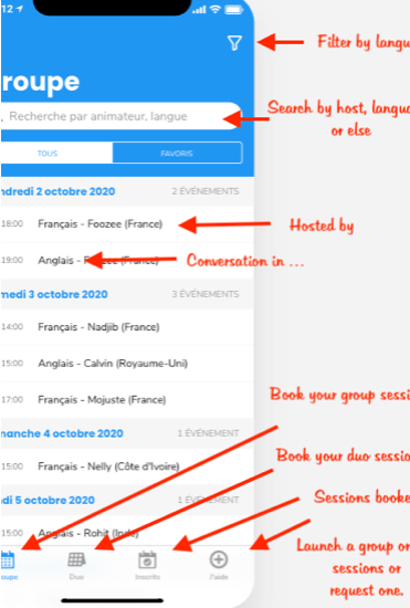 Utilisant la technique de la visioconfĂ©rence (intĂ©grĂ©e dans l’application), l’animateurâątrice volontaire assiste un petit groupe de personnes pour une conversation constructive dans une langue cible. Un thĂšme est proposĂ© dans le descriptif. Choisissez vos rĂ©unions et rĂ©servez vos places Ă l’avance.