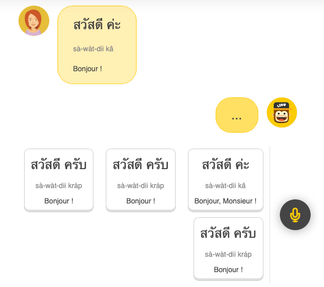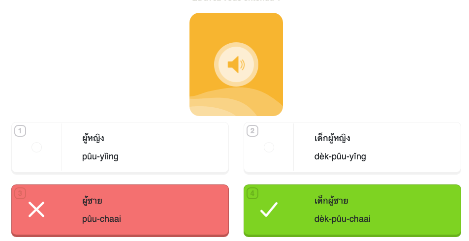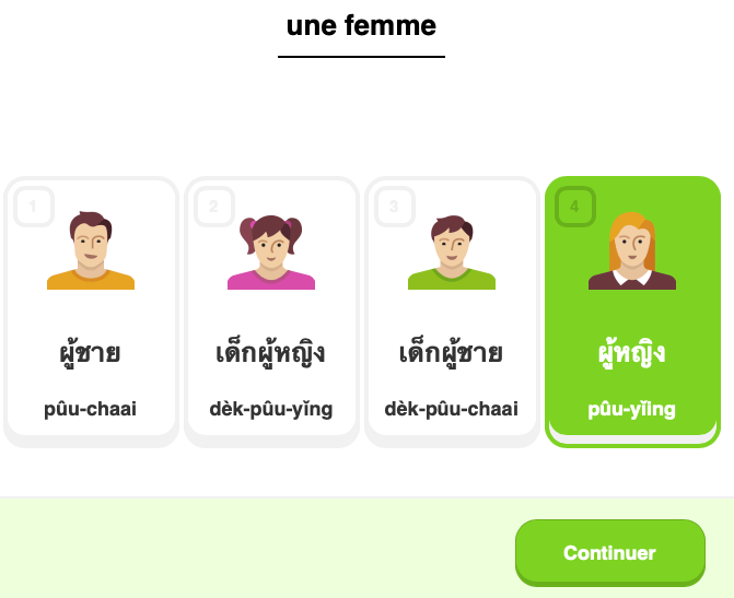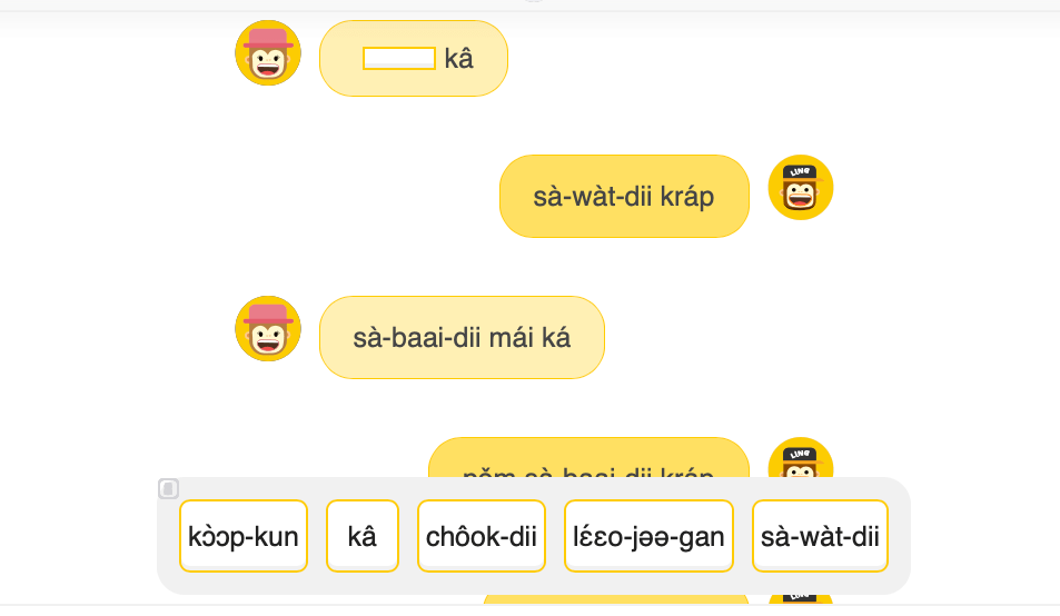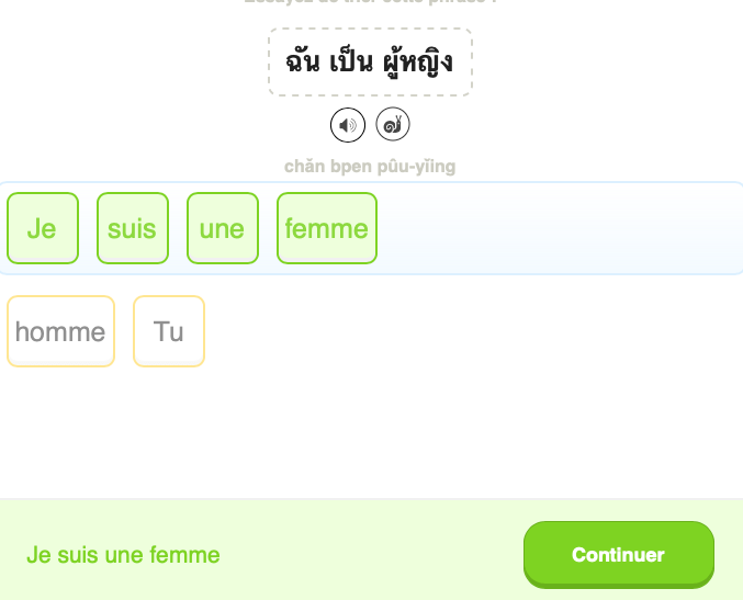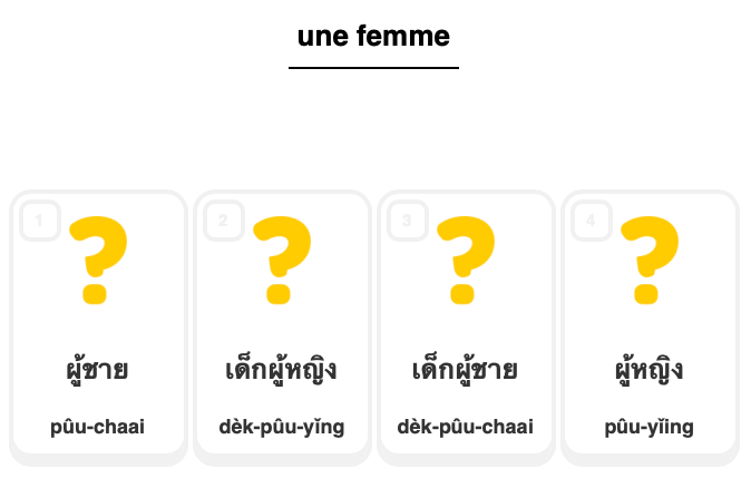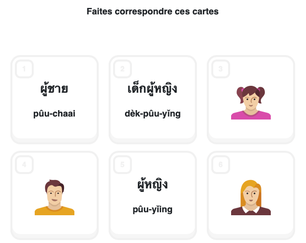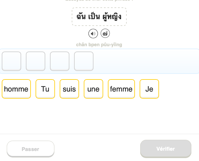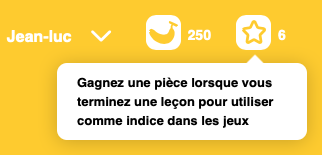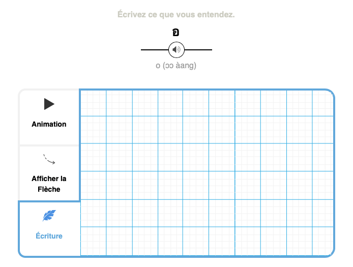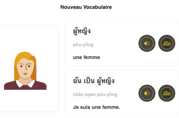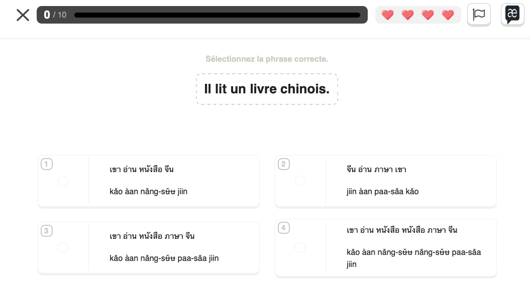 On trouve, en haut ou un bas, des blocs comme ci-dessous qui peuvent reprĂ©senter vos rĂ©compenses, mais aussi des outils intĂ©ressants. On peut en effet ajouter ou supprimer lors des leçons la reprĂ©sentation de la transcription latine ou la traduction. En mode avancĂ© ne reste que l’Ă©criture thaĂŻ…