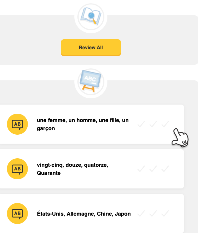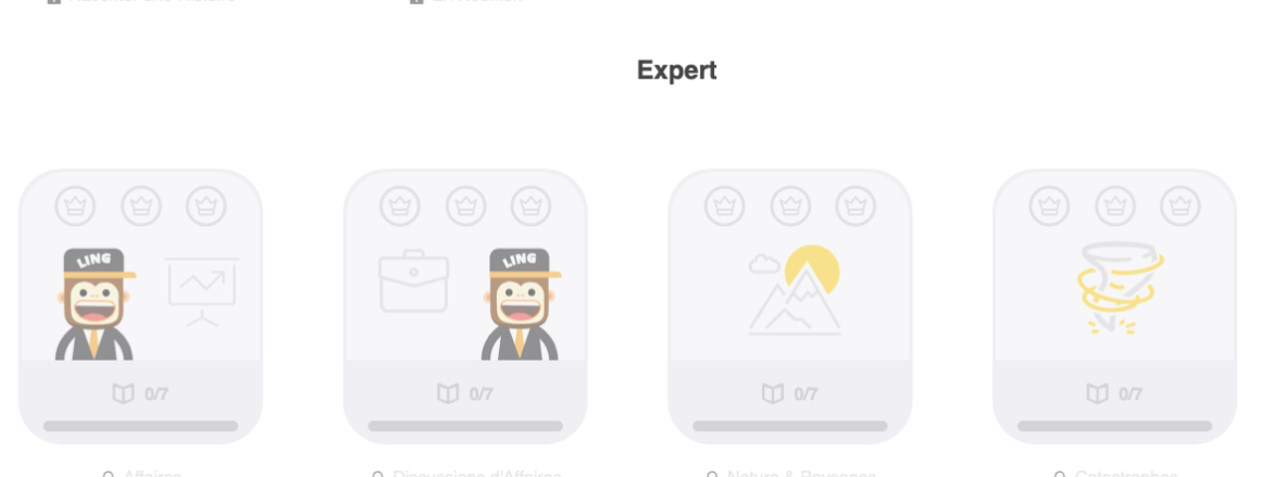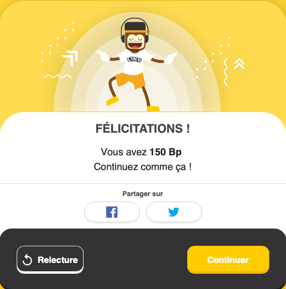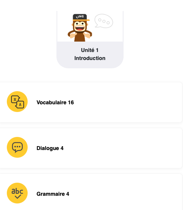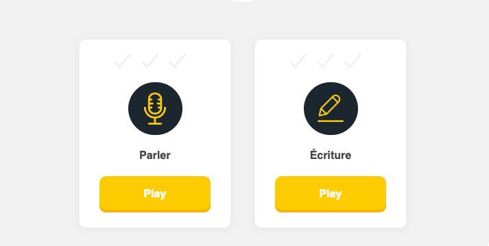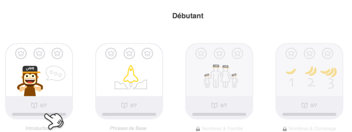 Comme pour les rĂ©visions, trois modules thĂ©matiques. Une classique barre permet de voir l’avancĂ©e de la leçon. Celle-ci, trĂšs courte, n’Ă©puisera pas l’apprenant đ avec une premiĂšre phase de dĂ©couverte puis une sĂ©rie de jeux (ou exercices).