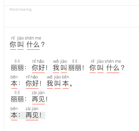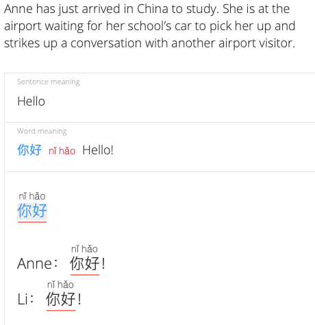 Une immersion bien faite avec la traduction en option aprĂšs Ă©coute. En survolant avec la souris des caractĂšres (en bleu) ou en cliquant sur un groupe de mots (grisĂ©), on obtient dans les cases du haut les traductions avec l’option hide (sentence or word meaning). Super pratiqueâŻ!