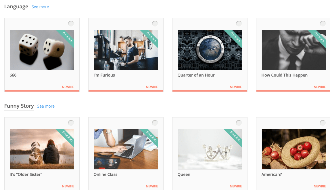 Un joli damier oĂč l’on peut trouver son bonheur en cochant Ă©ventuellement des critĂšres. Lumineux et simpleâŻ! Les thĂšmes sont trĂšs actuels et pragmatiques, une jolie collection de conversations donc (mais limitĂ©e sans un abonnement). Une case pour Ă©liminer les leçons dĂ©jĂ faites (Ă marquer dans celles-ci) et une barre de recherche complĂštent le menu.