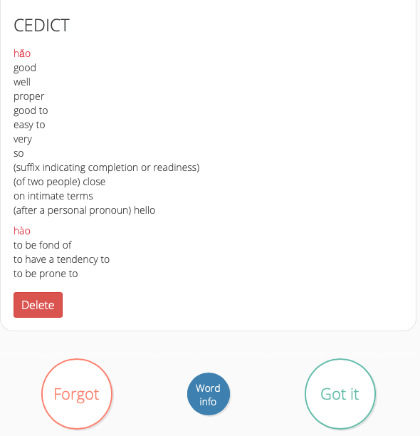 Tout mot sauvegardĂ© Ă partir de la leçon se retrouve ici. On peut gĂ©rer facilement sa base de mots pour mettre en avant ceux mal connus Ă l’aide des boutons en bas. Une interface simple, mais avec tous les Ă©lĂ©ments nĂ©cessaires pour apprendre