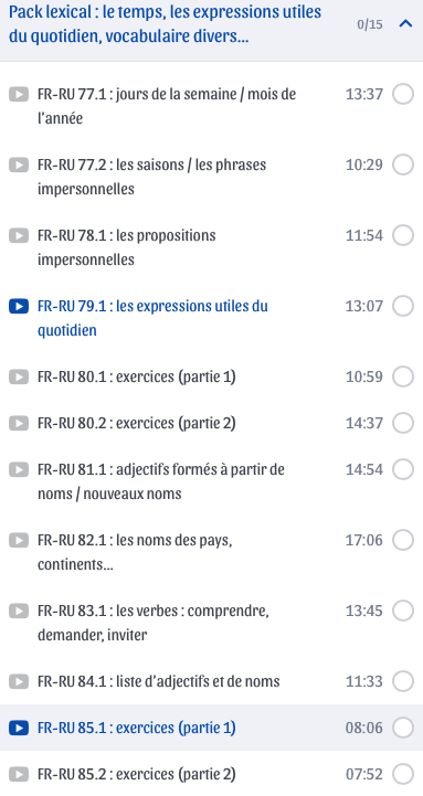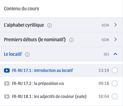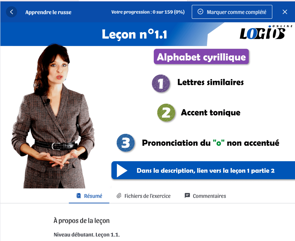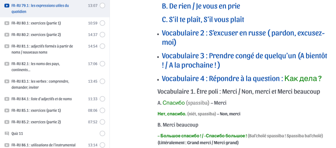 Prenons l’exemple du russe, langue qui n’est pas Ă©vidente au premier abord Ă apprendre et Ă enseigner. L’interface prĂ©sente sur le cotĂ© la barre (possibilitĂ© de l’escamoter) du programme. Nous y trouvons les chapitres en gris et le dĂ©tail des leçons avec sa numĂ©rotation (reprise au dĂ©but sur la vidĂ©o). Accessible Ă tout moment, on sait oĂč on est et oĂč on va! De plus, il est possible de revenir en un clic Ă une leçon pour la revoir.