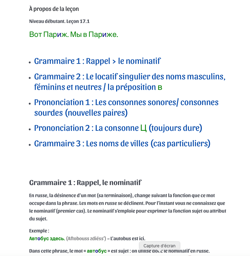 DĂšs la premiĂšre leçon, on constate le profondeur du cours. ici, on ne survole pas, mais on aborde de suite les aspects pointus. La clartĂ© de l’Ă©noncĂ© est impressionnante en comparaison avec d’autres cours et profs que j’ai connus ( les enseignantes du russe sont d’ailleurs en gĂ©nĂ©ral trĂšs exigeantes).