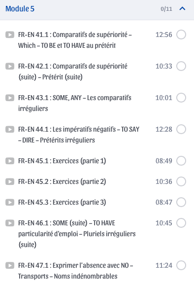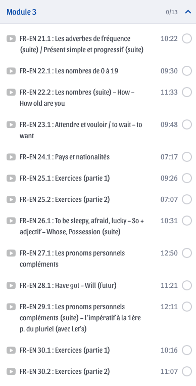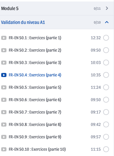 Le minutage des vidĂ©os est indiquĂ© et le rond blanc affiche le statut de la leçon que vous devrez vous-mĂȘme remplir en fin de leçon. Une grande libertĂ© contrairement Ă de nombreuses applications oĂč vous ĂȘtes bloquĂ©s Ă des niveaux en mode jeux vidĂ©os ou contraints par le mode linĂ©aire d’apprentissage.