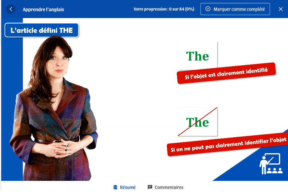 Il se dĂ©roule sous la vidĂ©o pour un mĂ©mo et rappel complet de la leçon. Imprimable (icĂŽne Ă droite), il peut ĂȘtre conseillĂ© de le faire Ă l’avance pour y inscrire des notes. Mis dans un classeur avec poches plastiques, il peut vous faire une grammaire Ă portĂ©e de main !