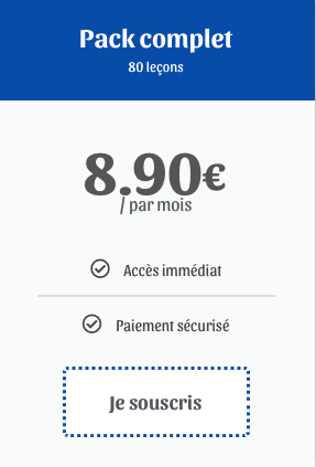 - L’obligation d’abonnement d’un an ! Le prix par mois est mis en avant, mais est conditionnĂ© Ă un abonnement longue durĂ©e… Habituellement dans le monde du web des langues Ă©trangĂšres, on a une libertĂ© d’abonnement qui est proposĂ©e au mois avec un tarif allĂ©chant pour s’engager sur 3,6 ou 12 mois ou une formule achat d’un pack une fois pour toute. Ici, une formule hybride et peu intĂ©ressante pour le client hĂ©sitant, car il a la prĂ©caritĂ© de l’abonnement et demande l’achat d’un pack d’un an sans remise. Cela donne l’impression (fausse ici) que le vendeur n’est pas confiant dans son produit et cela risque aussi de faire fuir des clients potentiels.