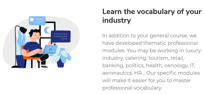 La formule avec coaching apporte un rĂ©el suivi et de l’oral, mais surtout une base de vocabulaire « pro » dont certains Ă©lĂ©ments seraient bien utiles pour les Ă©tudiants… trĂšs tendance, elle a souvent le dĂ©faut de ne pas individualiser le coaching. Une formule Ă la demande permettrait de choisir le nombre d’interventions selon sa personnalitĂ© et serait ouverte aux « Ă©tudiants » ou tout autre apprenant.