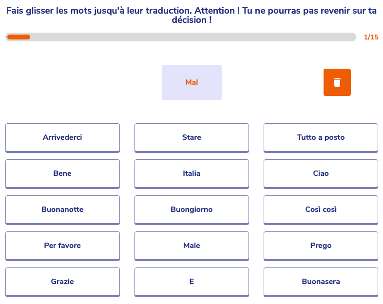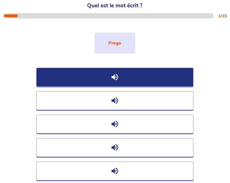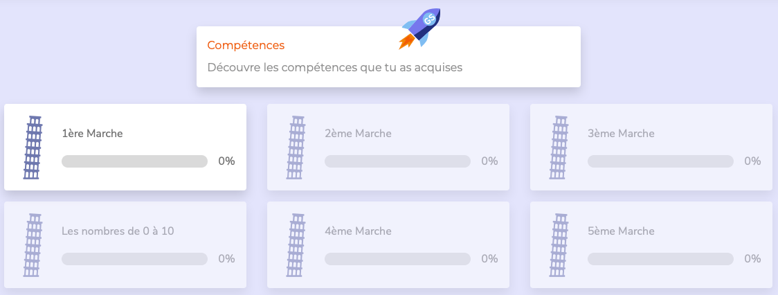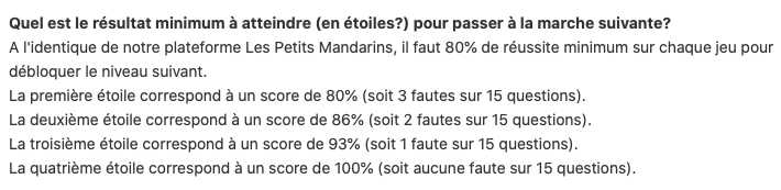 Elle est une application semi-linĂ©aire qui trace votre chemin avec une libertĂ© dans le choix de l’Ă©tude des leçons de grammaire ou des jeux. Mais pour passer Ă l’Ă©tape suivante, vous devez satisfaire Ă un rĂ©sultat minimum (80% de taux de rĂ©ussite pour ne pas ĂȘtre bloquĂ©) et pouvoir accĂ©der Ă la marche suivante.