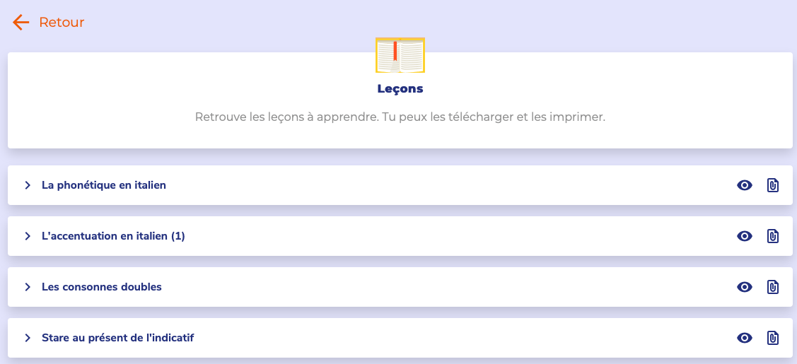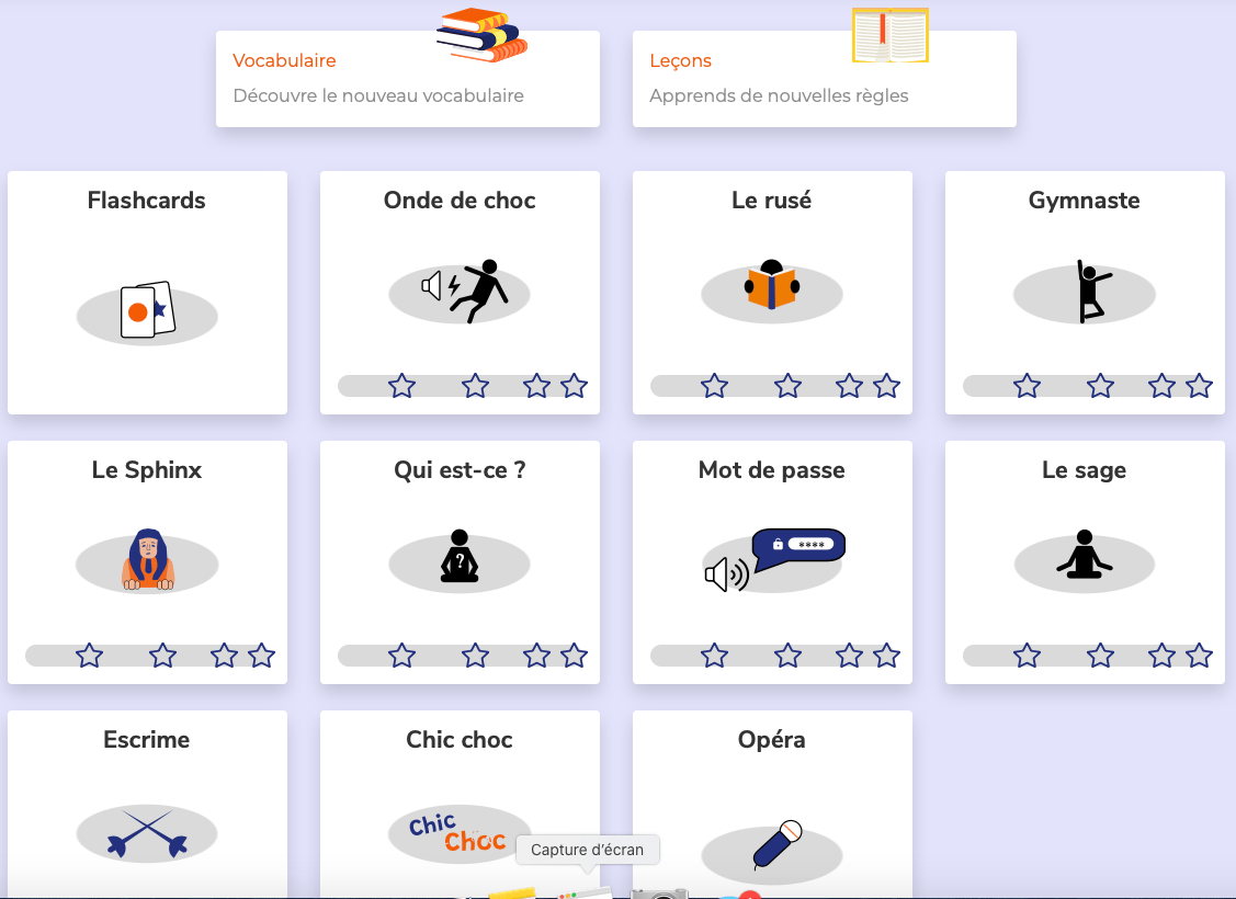 Présent également, Un mini flashcard qui permet de réviser le vocabulaire du niveau en cours (un autre, celui du vocabulaire, ne fait que ceux du cours étudié).
