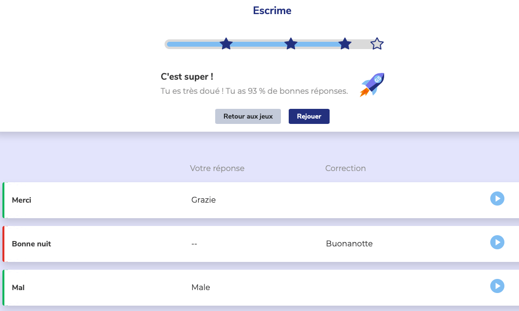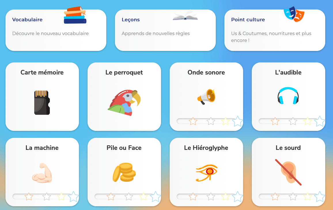 Une fois Ă©tudiĂ©e, la gamme de jeux va vous permettre d’enregistrer les mots dans la mĂ©moire Ă long temps en les reprenant sous diffĂ©rents aspects et angles (Ă©crit, images, sons…) Les Ă©toiles, remplies ou non, indiquent votre degrĂ© de rĂ©ussite et sont beaucoup plus sympas que les % habituels !
