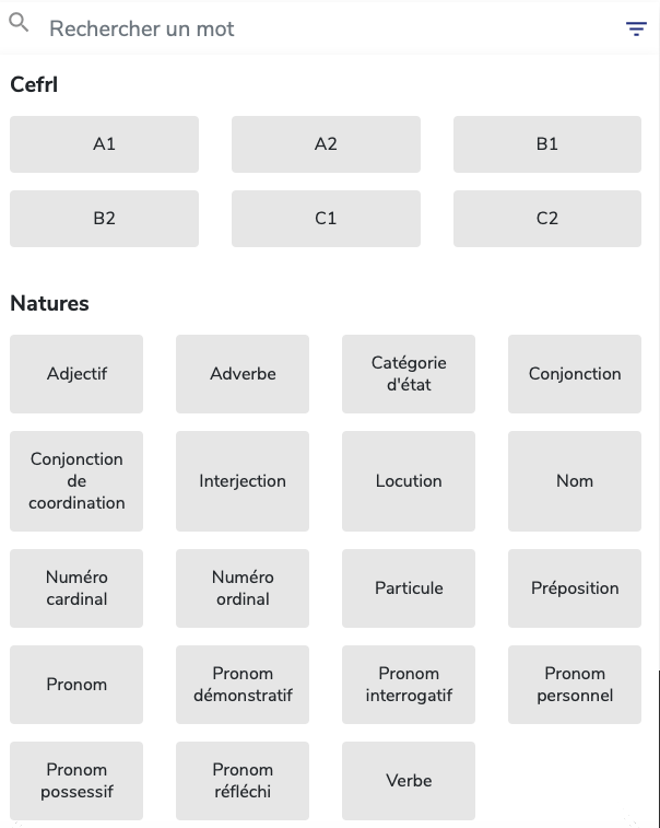 Il est ici aussi possible de retrouver une leçon de grammaire ou faire une recherche dans le dictionnaire de tous les mots utilisĂ©s dans l’application.