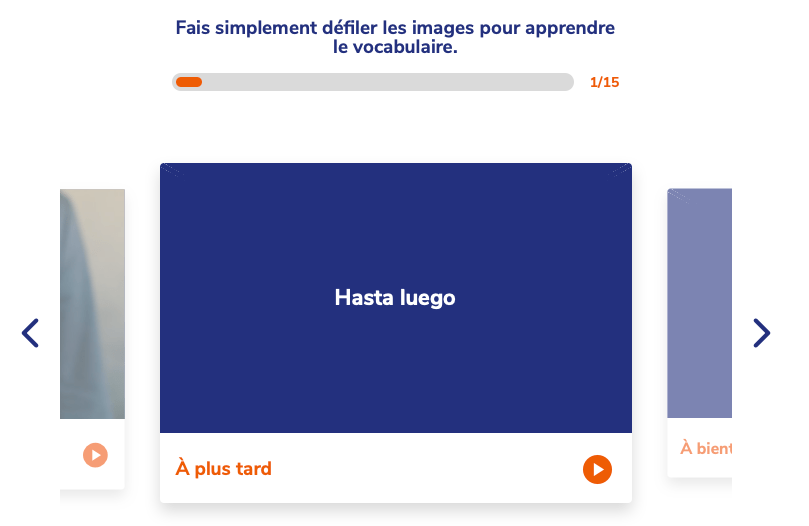 Pour réviser le vocabulaire de suite ou plus tard, le flashcard dans votre tableau de bord. Minimaliste, il est rapide et efficace.