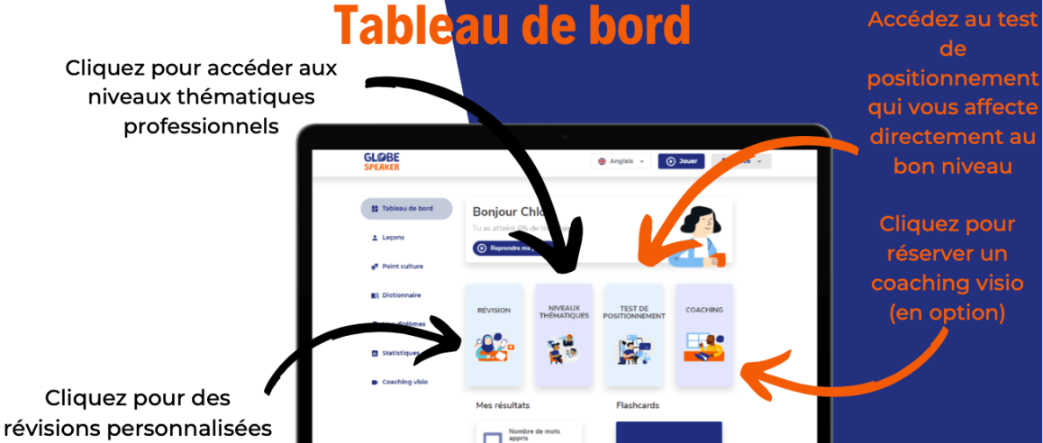 Globespeaker s’adresse aussi aux organisations, Ă l’enseignement et les entreprises. Une plateforme trĂšs Ă©tudiĂ©e de gestion permet de piloter vos apprenants :
