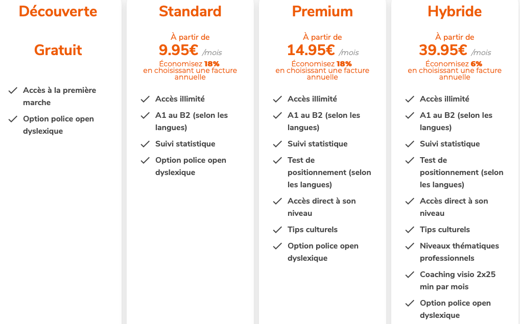 - Le prix par langue n’est pas compĂ©titif pour les polyglottes (exemple : un package autour de 30 euros/mois pour 5 langues (l’accĂšs Ă toutes les langues pour le mĂȘme prix est devenu la rĂšgle sur le marchĂ© international…)