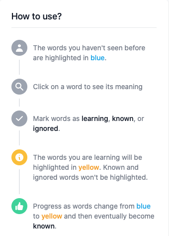 - Joli systĂšme, mais identique (en plus simplifiĂ©) Ă Lingq en reprenant exactement ses mĂȘmes couleurs…
