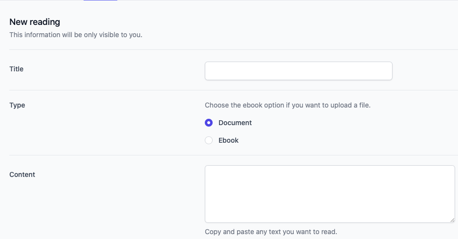 C’est la phase d’importation et de premiĂšre Ă©tude du texte. Une interface simple oĂč l’on peut importer un texte collĂ© dans la case ou un E-book et PDF. Le logiciel transforme les textes et les prĂ©sentent avec chaque mot individualisĂ© et de couleur bleue.
