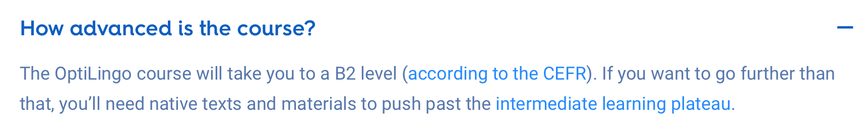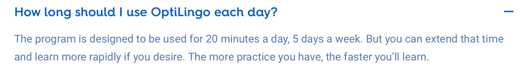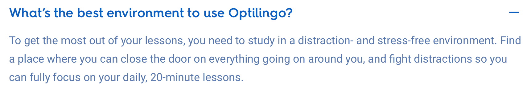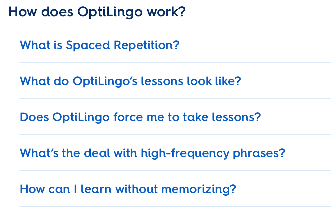 Beaucoup seront dĂ©paysĂ©s et se sentiront rapidement bloquĂ©s ou dĂ©paysĂ©s. Mais Optilingo, encore un nom pas trĂšs diffĂ©renciant dans le monde des langues, est agrĂ©able grĂące Ă son ultra-concision et son ciblage prĂ©cis pour travailler l’expression. Mais comme toujours avec cette mĂ©thode, il faudra aller chercher des complĂ©ments ou ĂȘtre dĂ©jĂ initiĂ© Ă la langue pour l’optimiser !