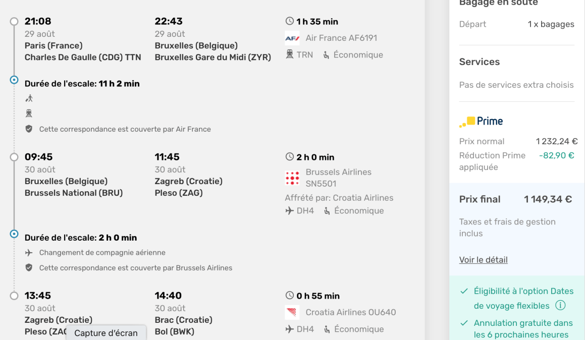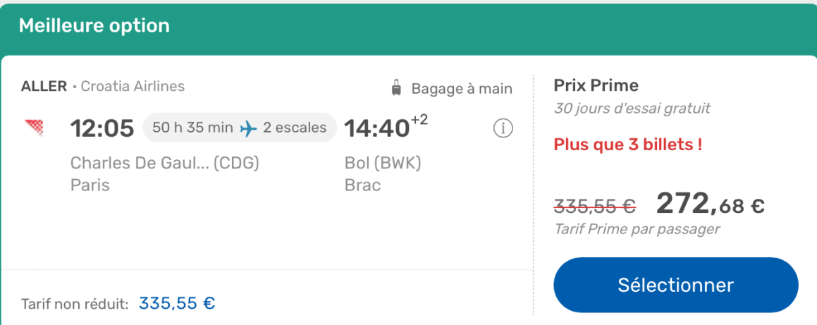 Pour bien comprendre l’exemple ci-dessous, il existe un Paris Zagreb direct de moins de deux heures et un Zagreb – Bol direct (en saison) d’une heure… Le coup de la meilleure option, un grand classique, c’est donc ici 50H35 mn et deux escales. Encore merci l’algo !