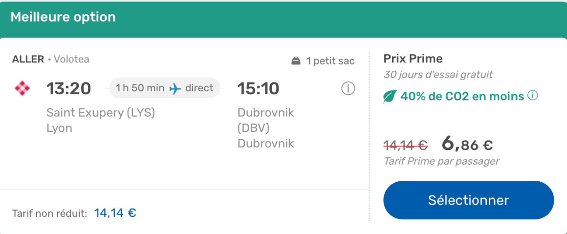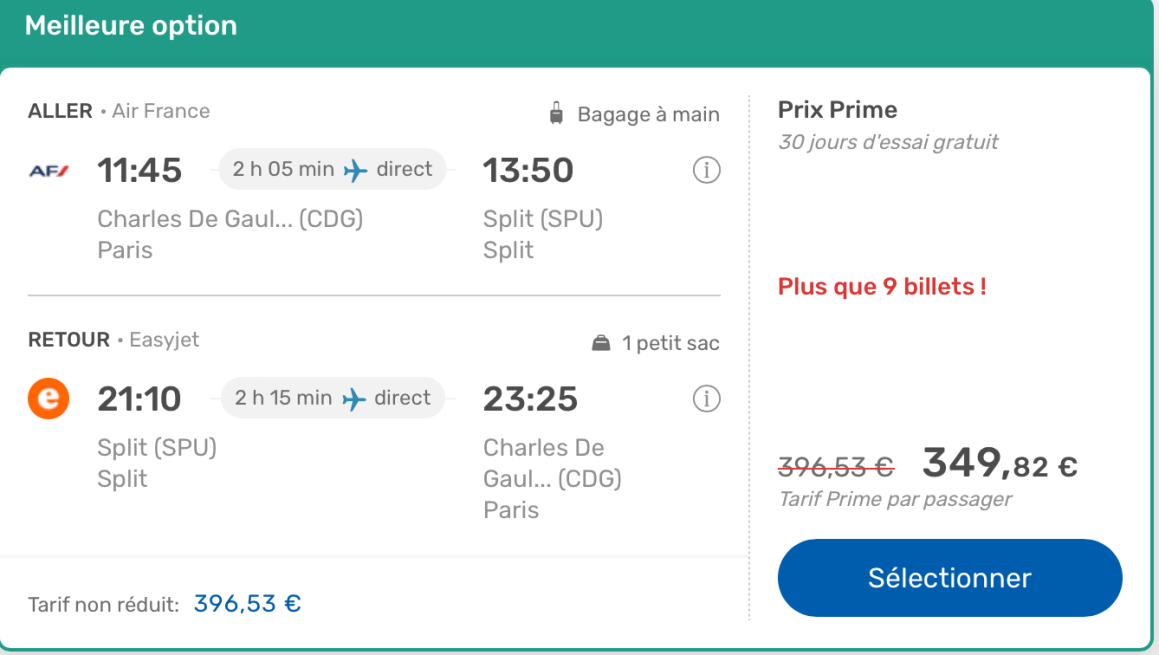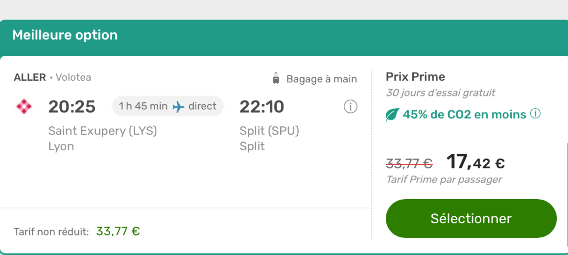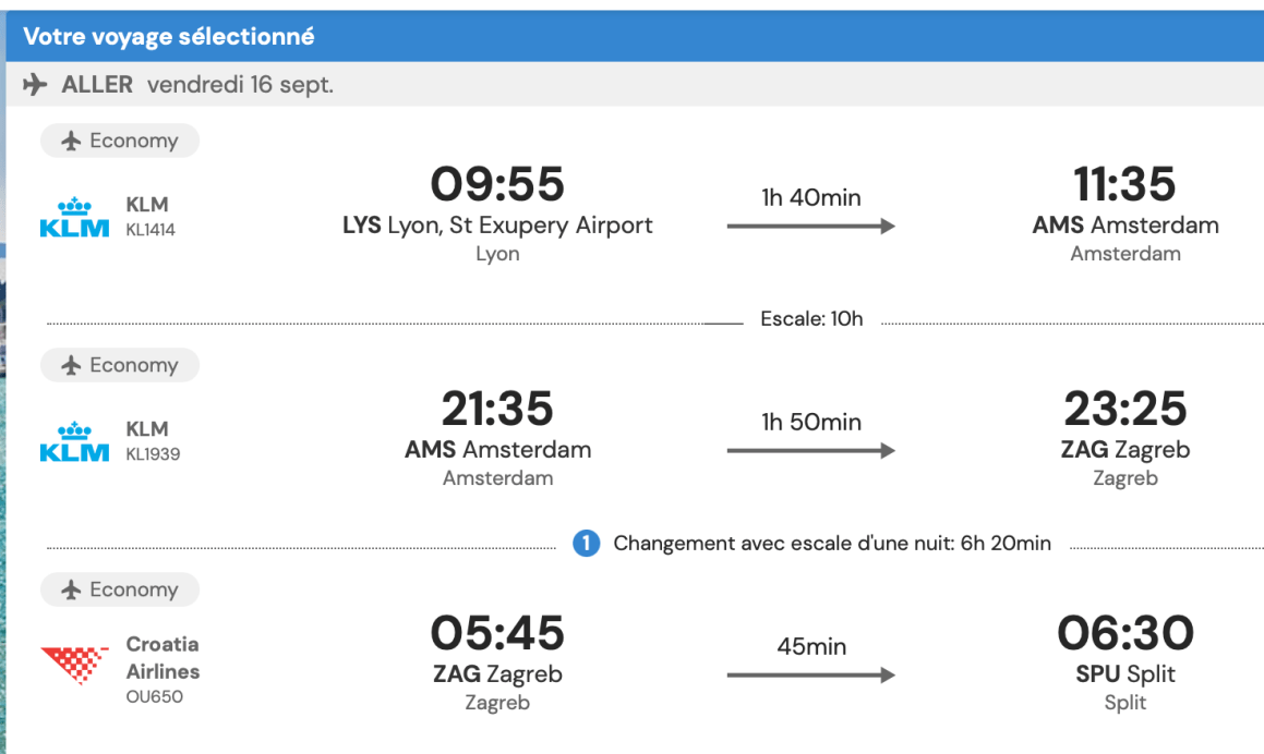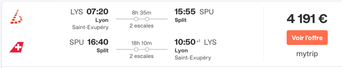 Rebelote avec cette « meilleure proposition » Lyon-Split (vols directs qui n’existent pas pour ce comparateur) qui propose deux escales et 9h40 de voyage (en espĂ©rant aucun retard ou annulation):