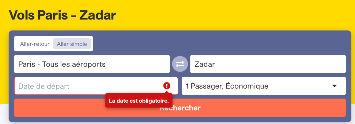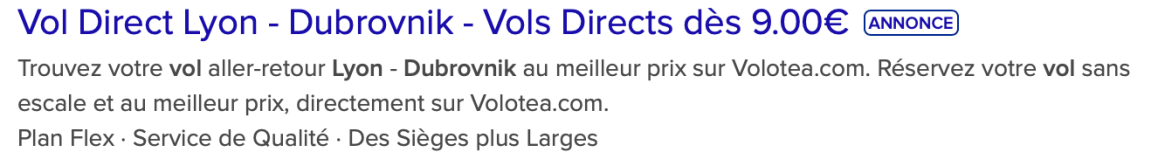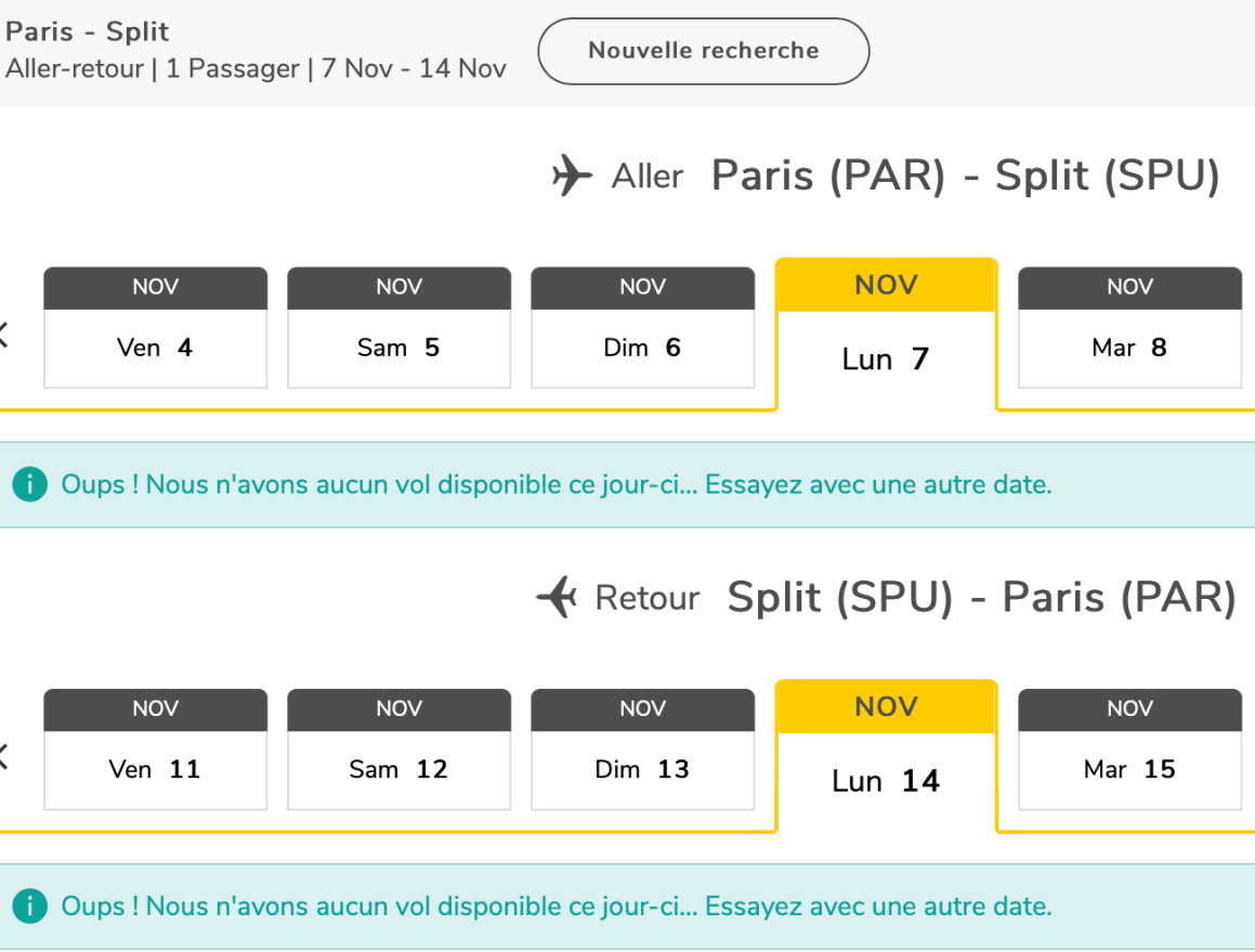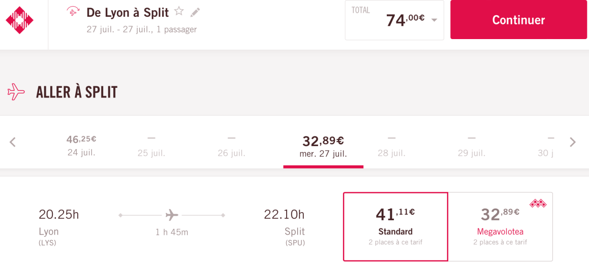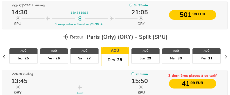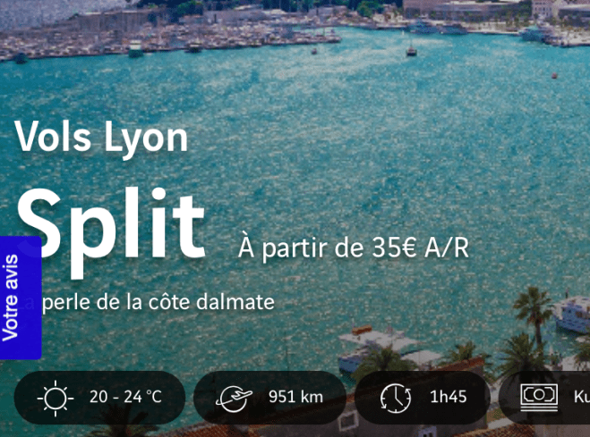 Pour mĂ©moire, il existe un TGV de Lyon Ă l’aĂ©roport CDG (2 heures) et un vol rĂ©gulier pour Split (2 heures) sur Air France autour de 300 euros aller et retour… Pourquoi alors afficher de tels rĂ©sultats ? Pour faire croire Ă la bonne affaire ou pour afficher un nombre flatteur de rĂ©sultats pour le SEO ?