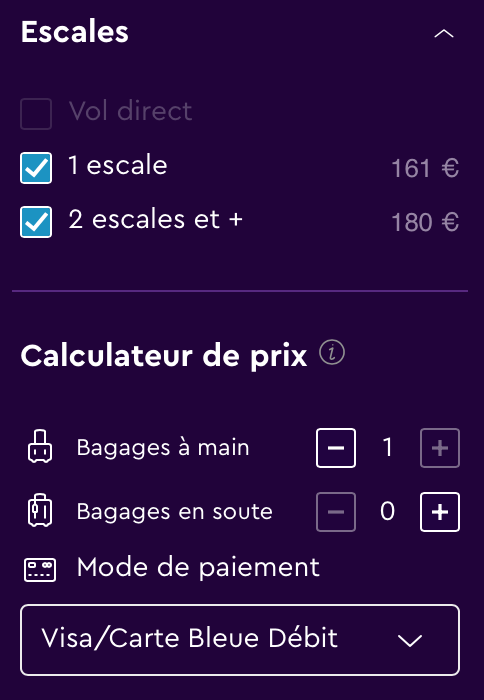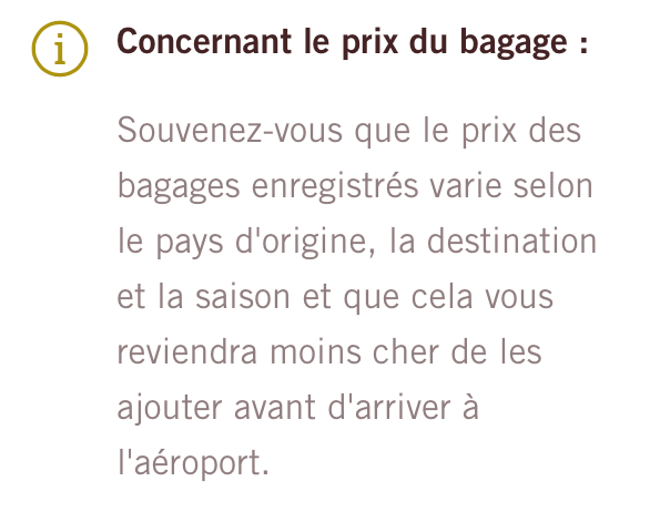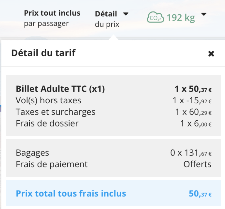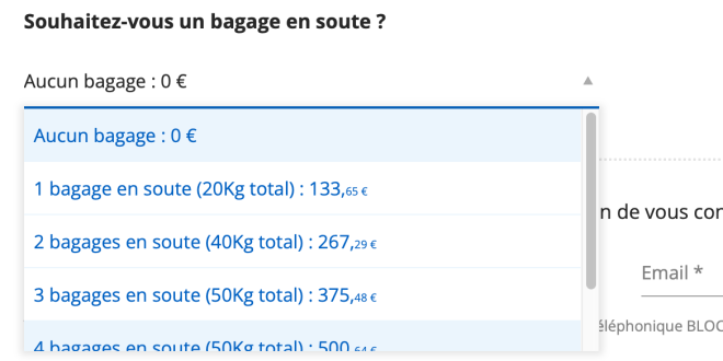 Attention, les bagages concernĂ©s sont aussi ceux en cabine, y compris le petit sac des enfants ou ceux des duty-free achetĂ©s (c’est selon les compagnies). Une petite visite Ă ces tarifs vous permet de reconsidĂ©rer les compagnies rĂ©guliĂšres oĂč les bagages sont inclus et peu limitĂ©s (mais elles sont en cours d’adopter les mĂȘmes mĂ©thodes pour afficher des prix concurrentiels). La tarification bagages apparait aussi souvent au moment de la commande, parfois mĂȘme aprĂšs l’enregistrement de votre nom et adresse mail. Tout ça transforme et complique la recherche.